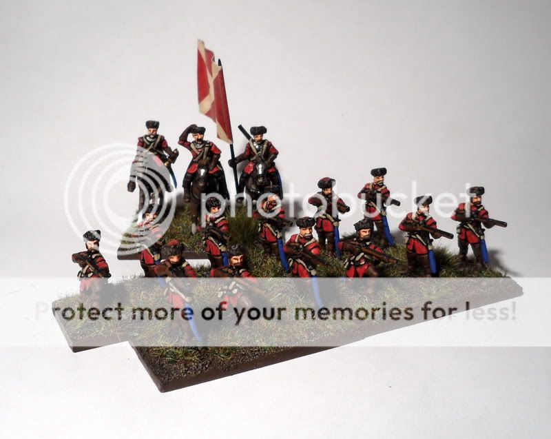 Wood on the muskets is painted with Vallejo Bestial Brown, the sword sheaths with Vallejo Ultramarines blue. Buckles, sword pommels and handguards as well as the metal on the muskets is painted with GW Boltgun Metal and then given a wash of Badab Black.